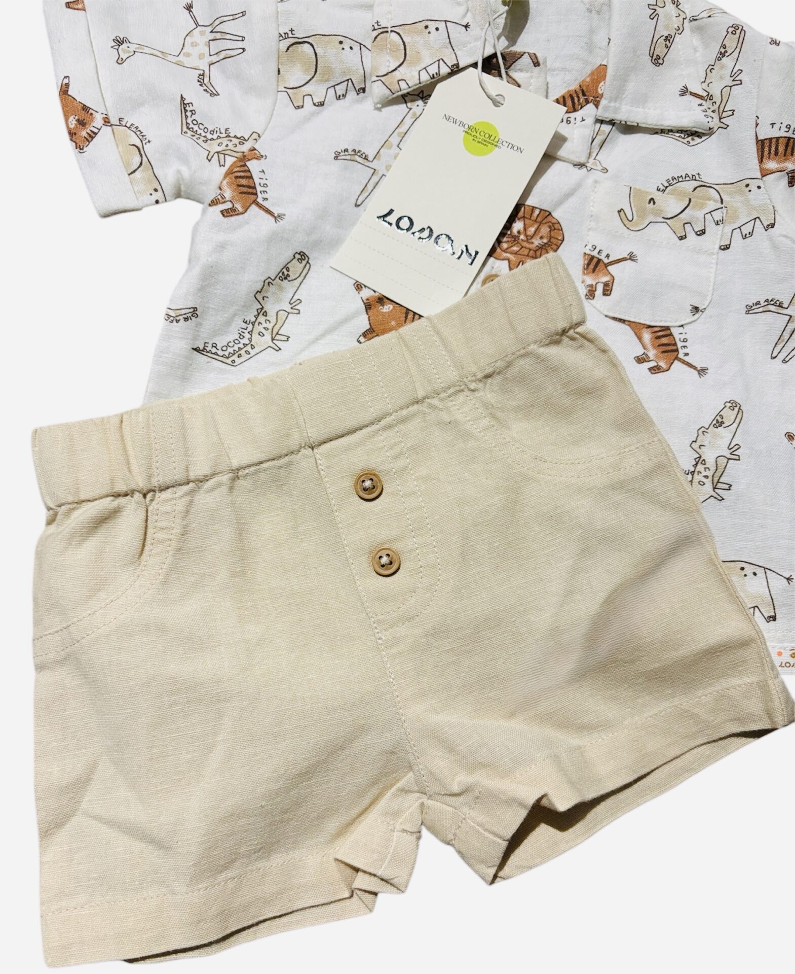 Chemise avec des motifs animaux de la savane et short écru bébé garçon.