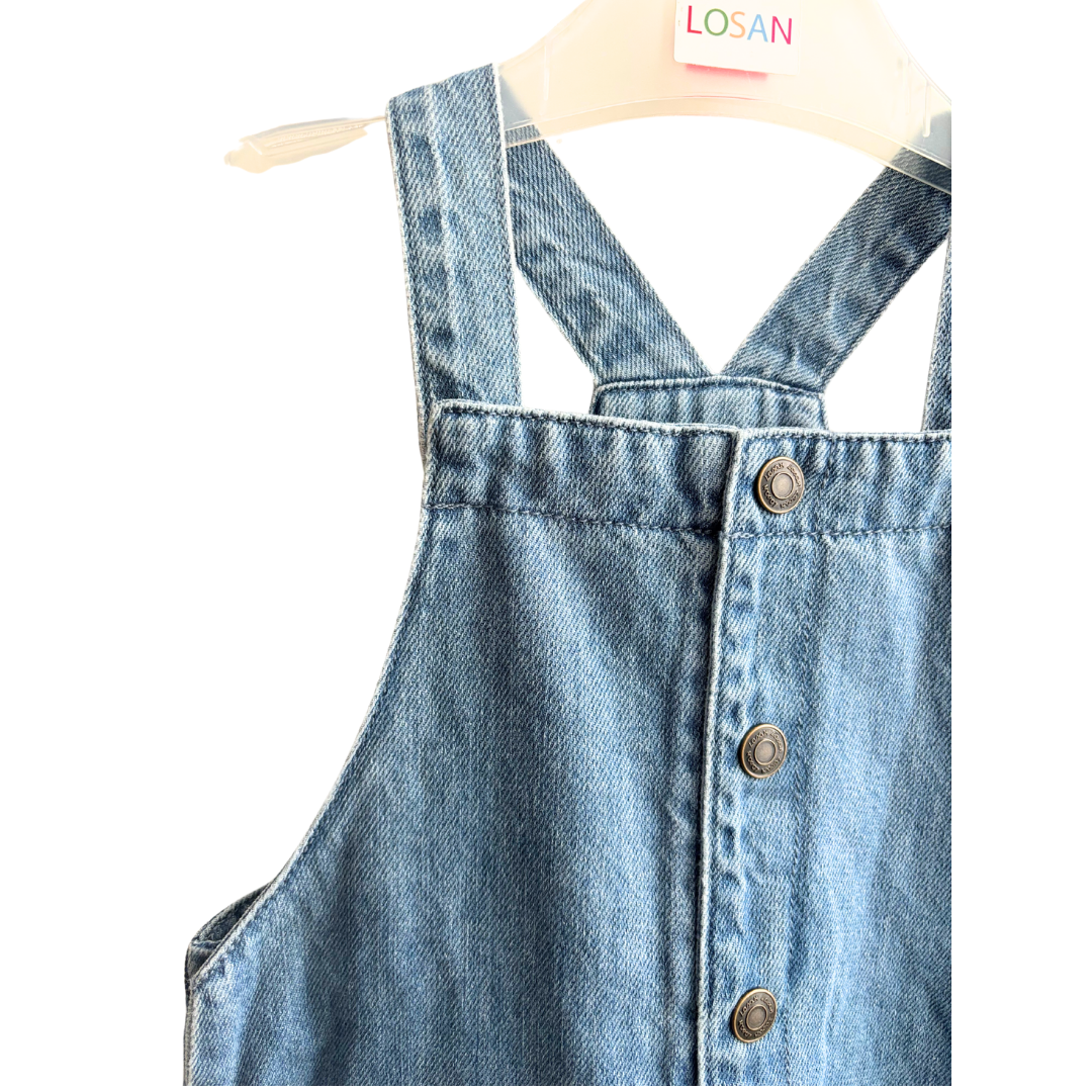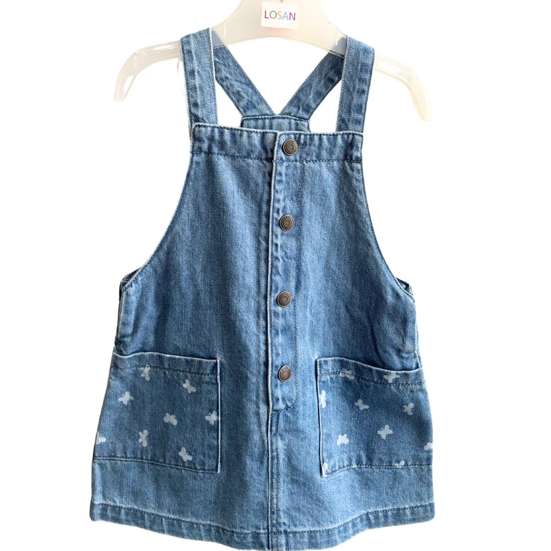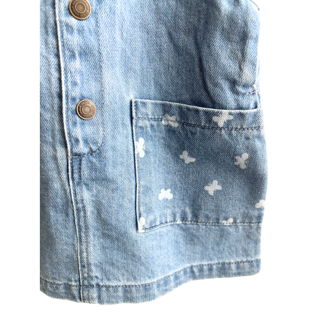 Robe en jean avec petit papillon sur les poches avant et bouton sur le devant.
