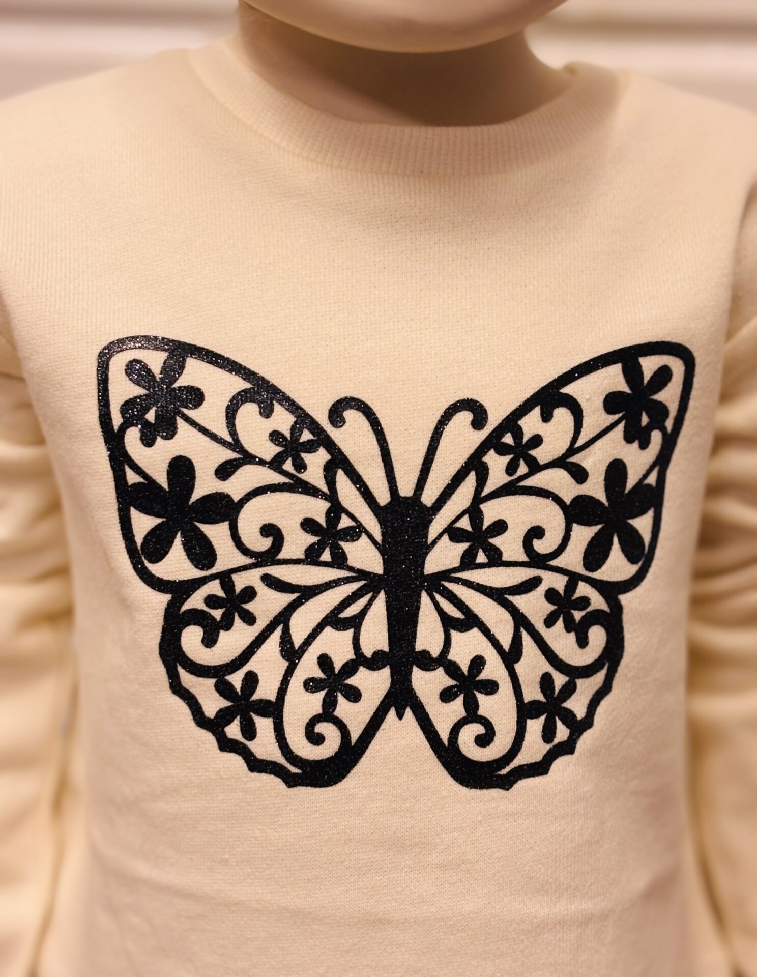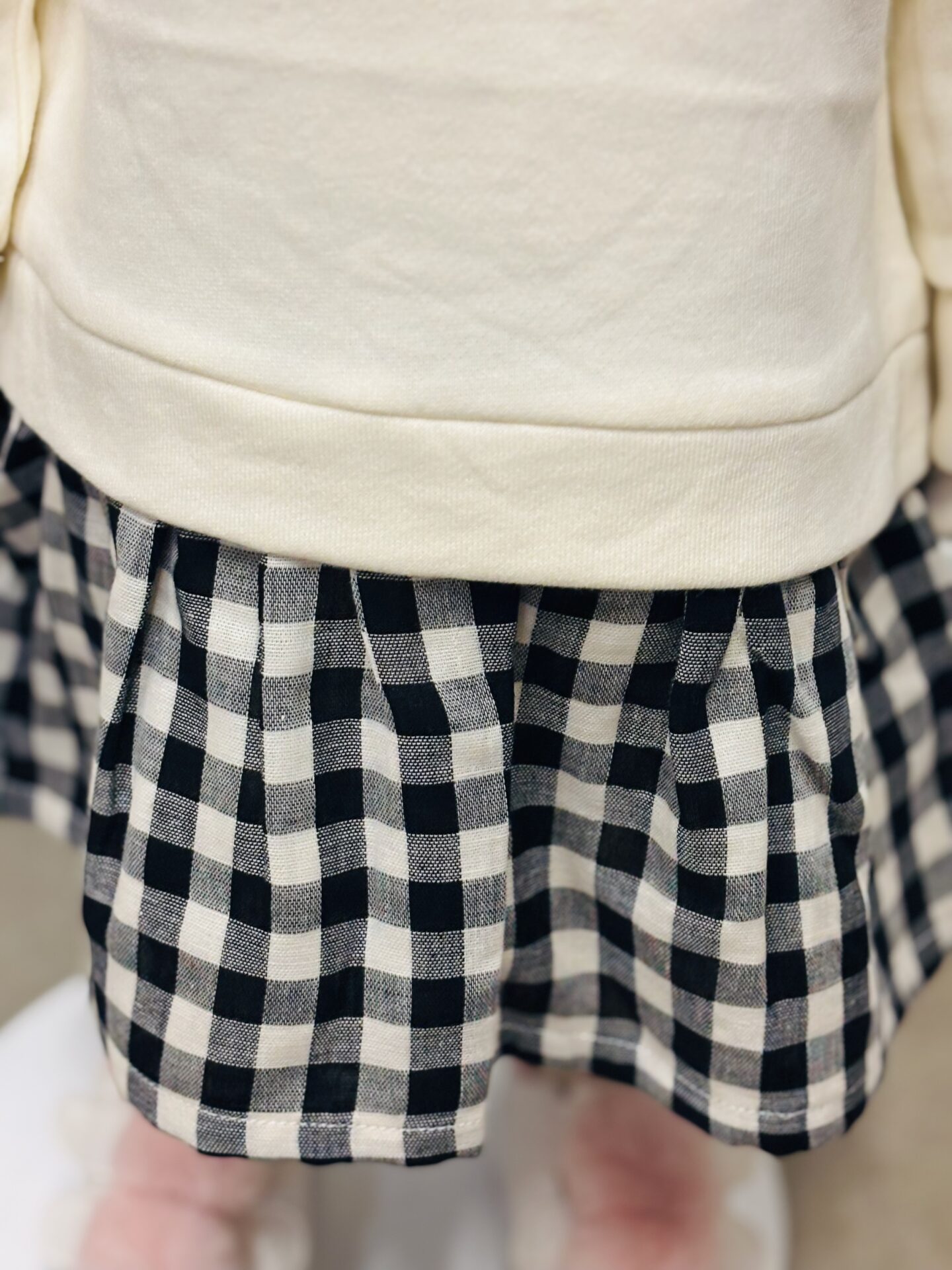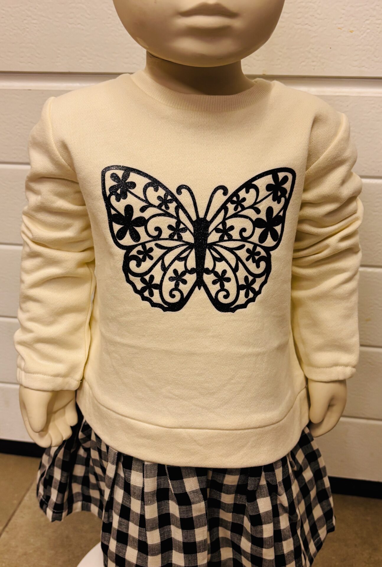 Sweat beige avec papillon noir sur le dessus et jupe à carreaux en dessous. (tout attaché)