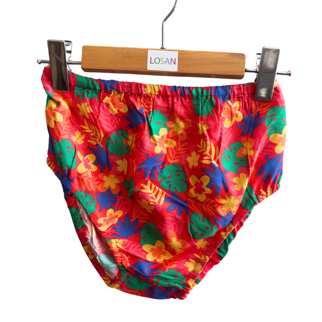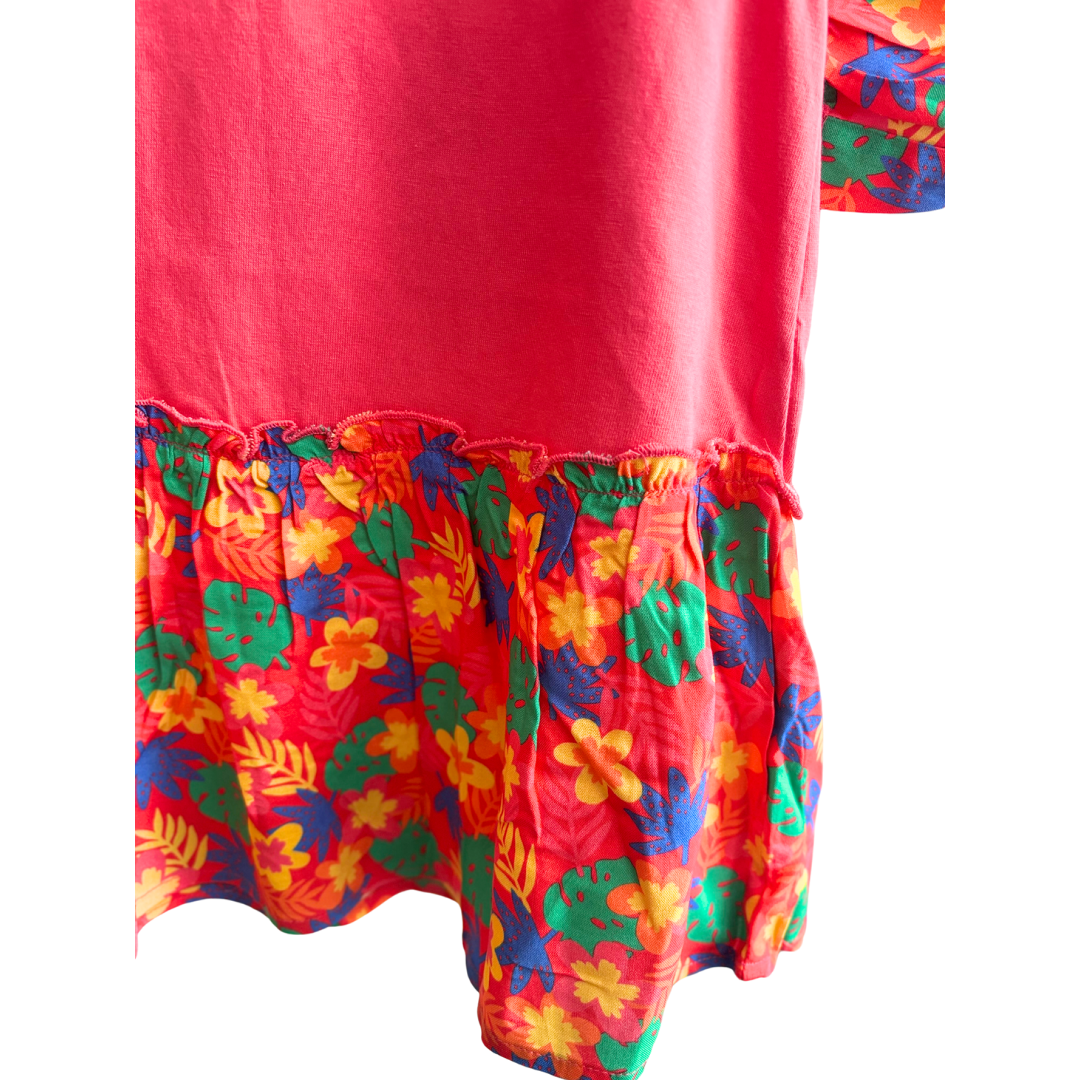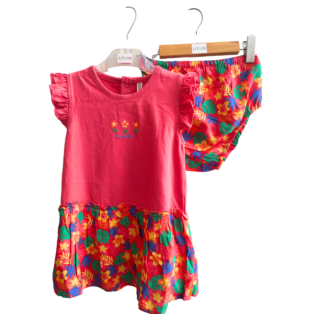 Robe jersey rose et fleur avec voile dans le bas et sa culotte.