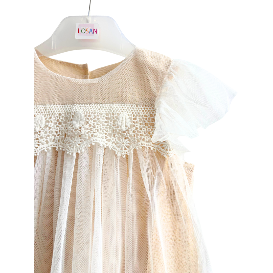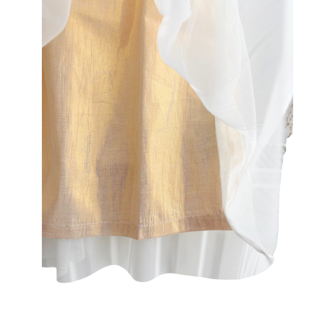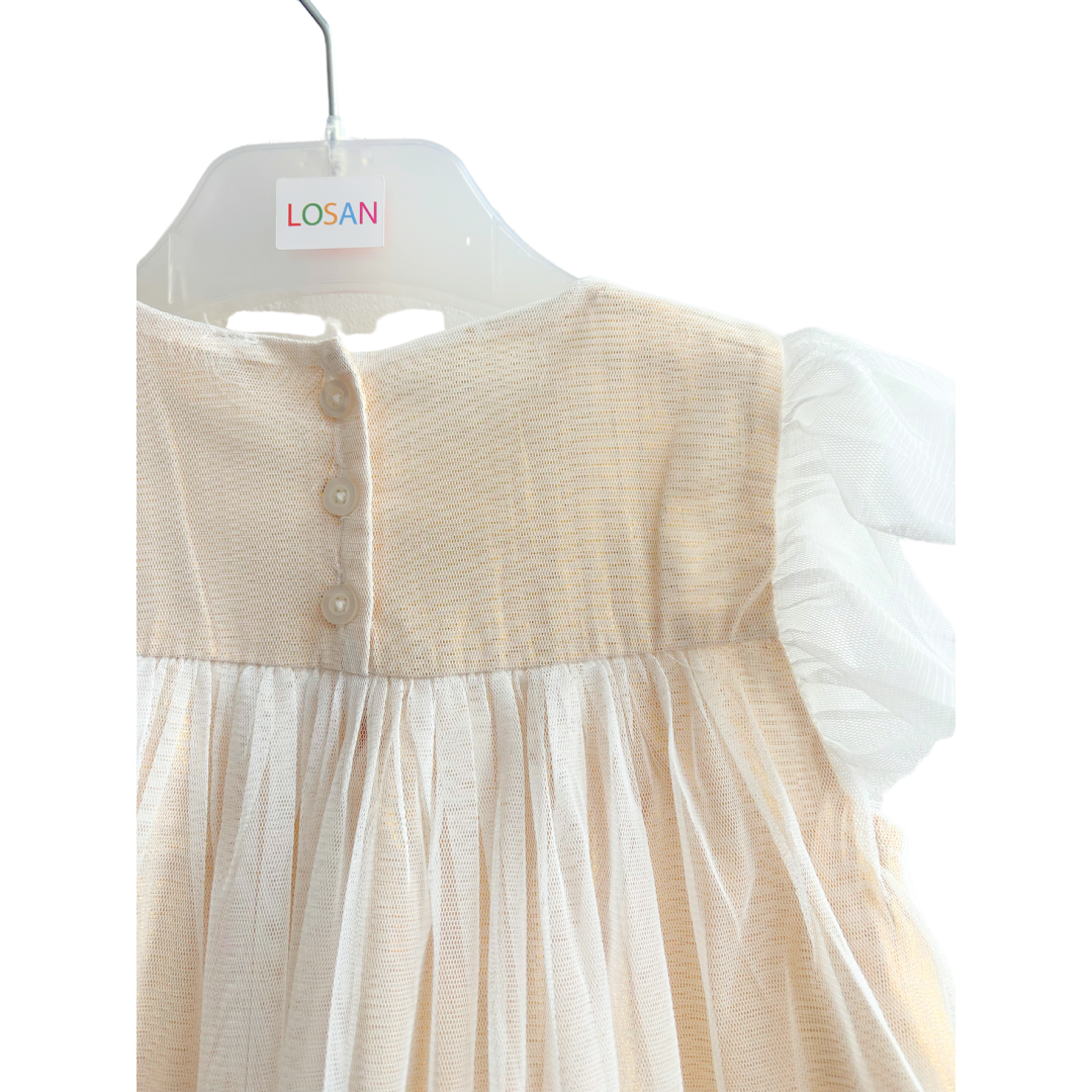 Robe tulle écru et doré avec du tricot sur le devant, bouton sur l’arrière.