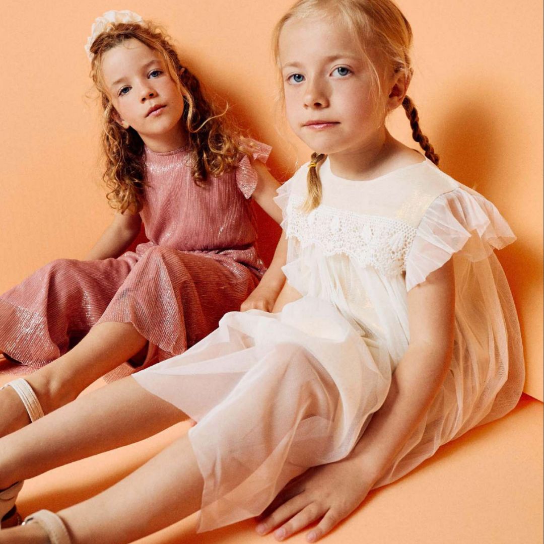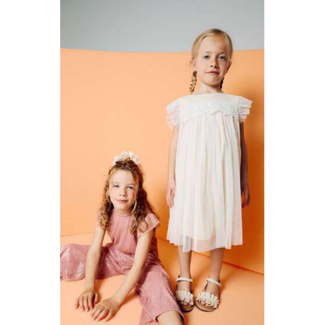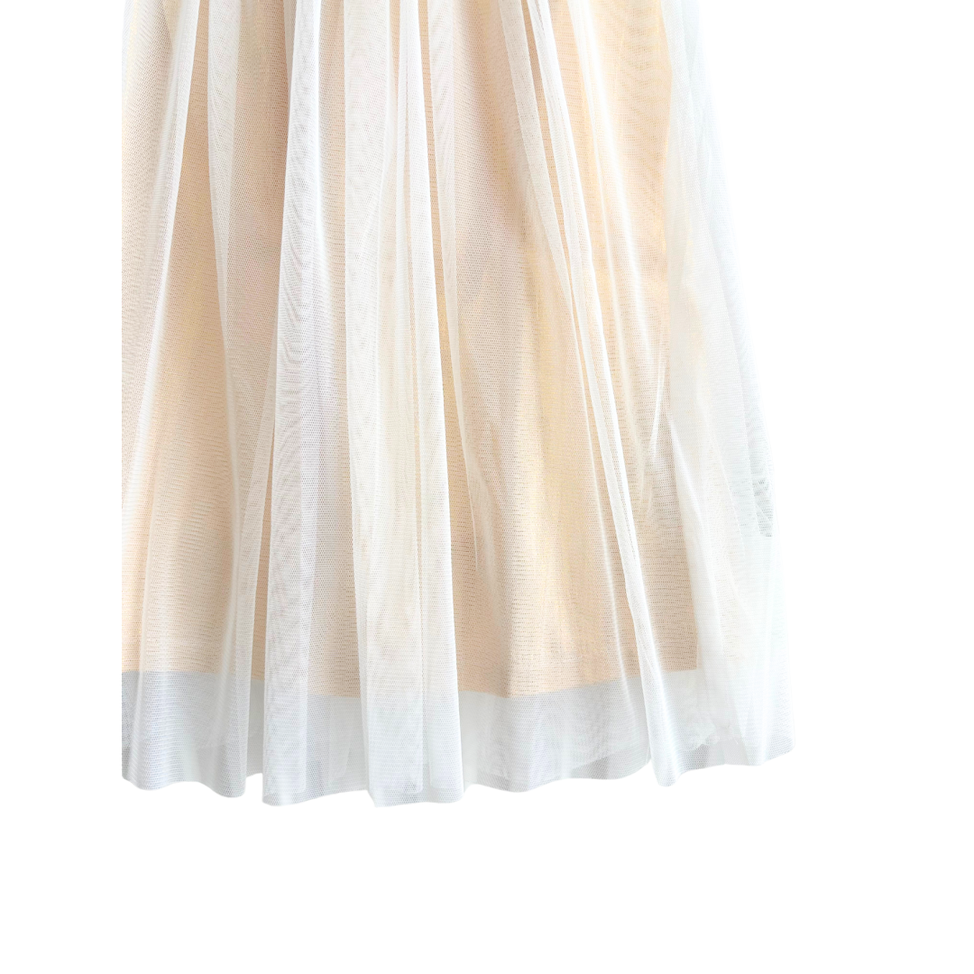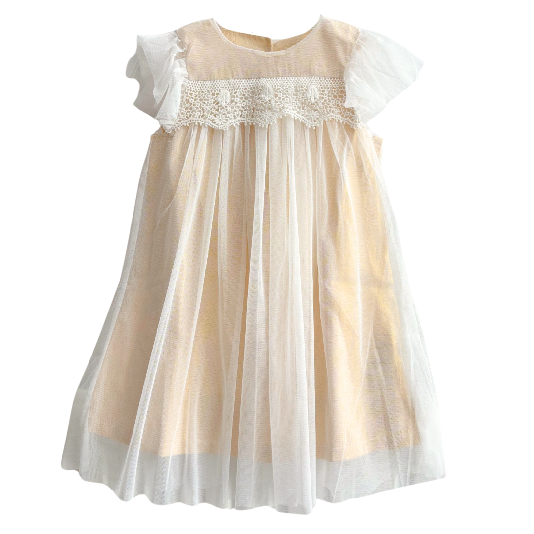 Robe tulle écru et doré avec du tricot sur le devant, bouton sur l’arrière.