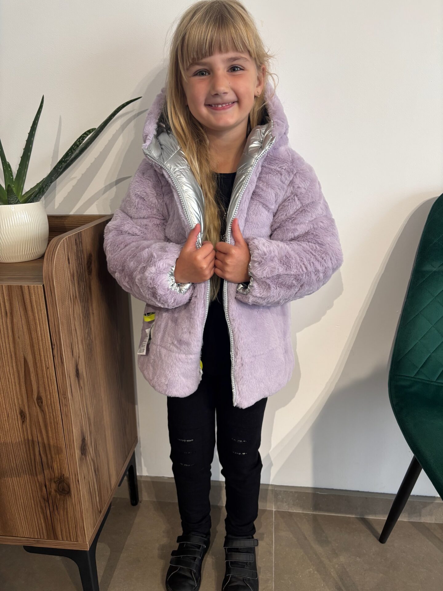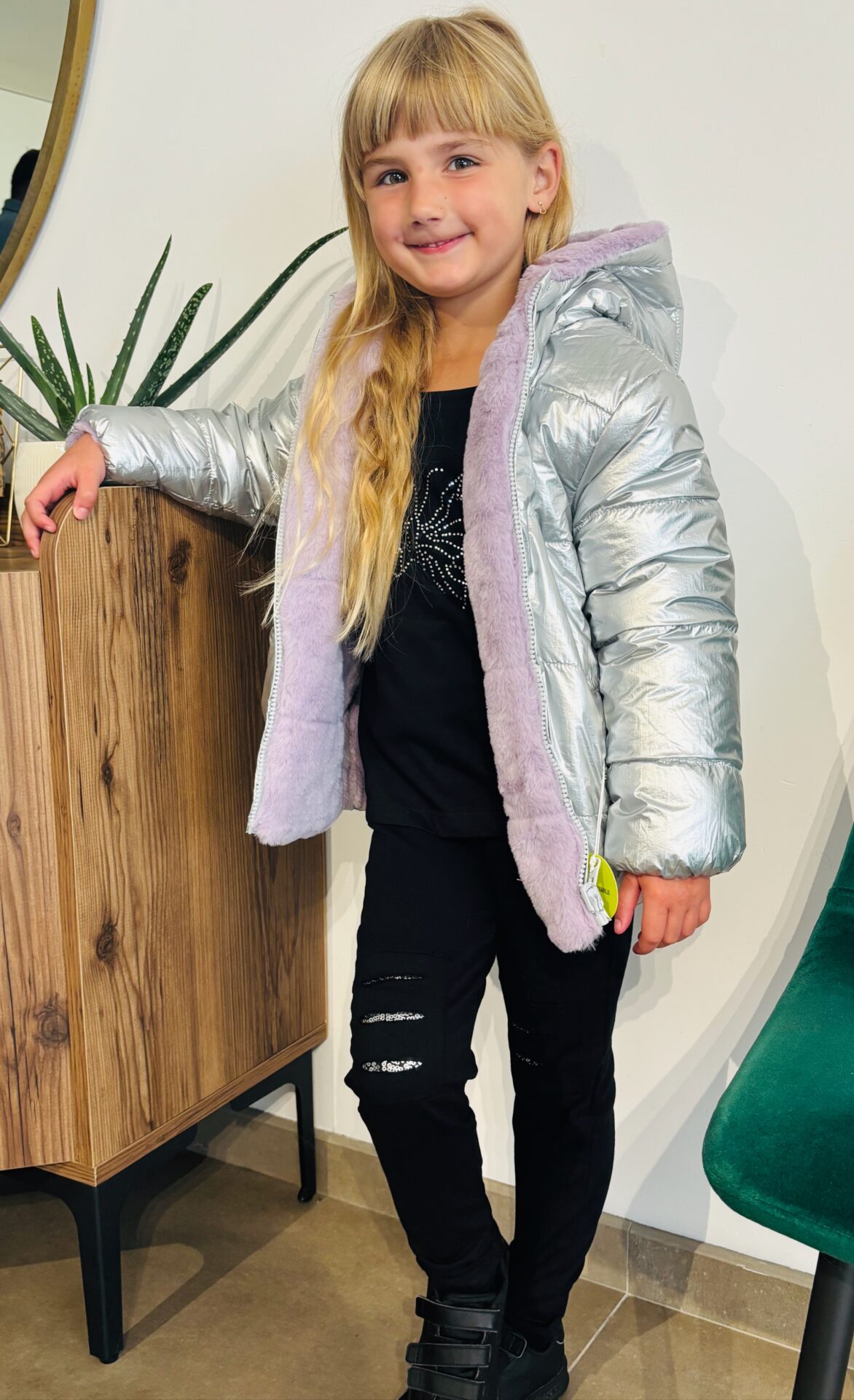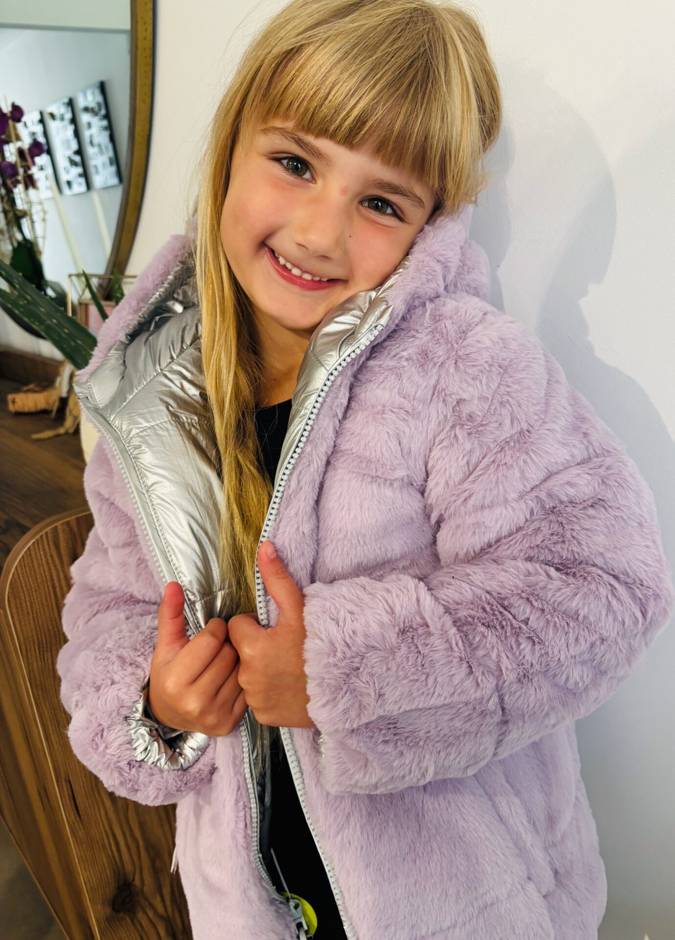 manteau réversible argenté/mauve fourrure.