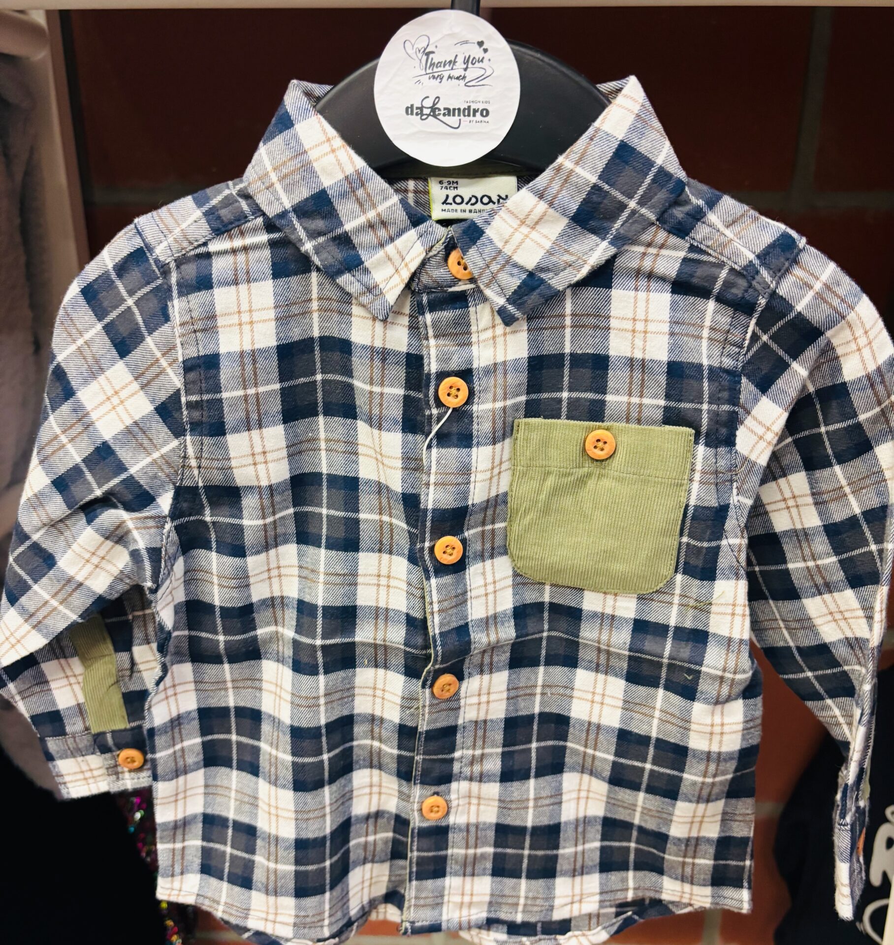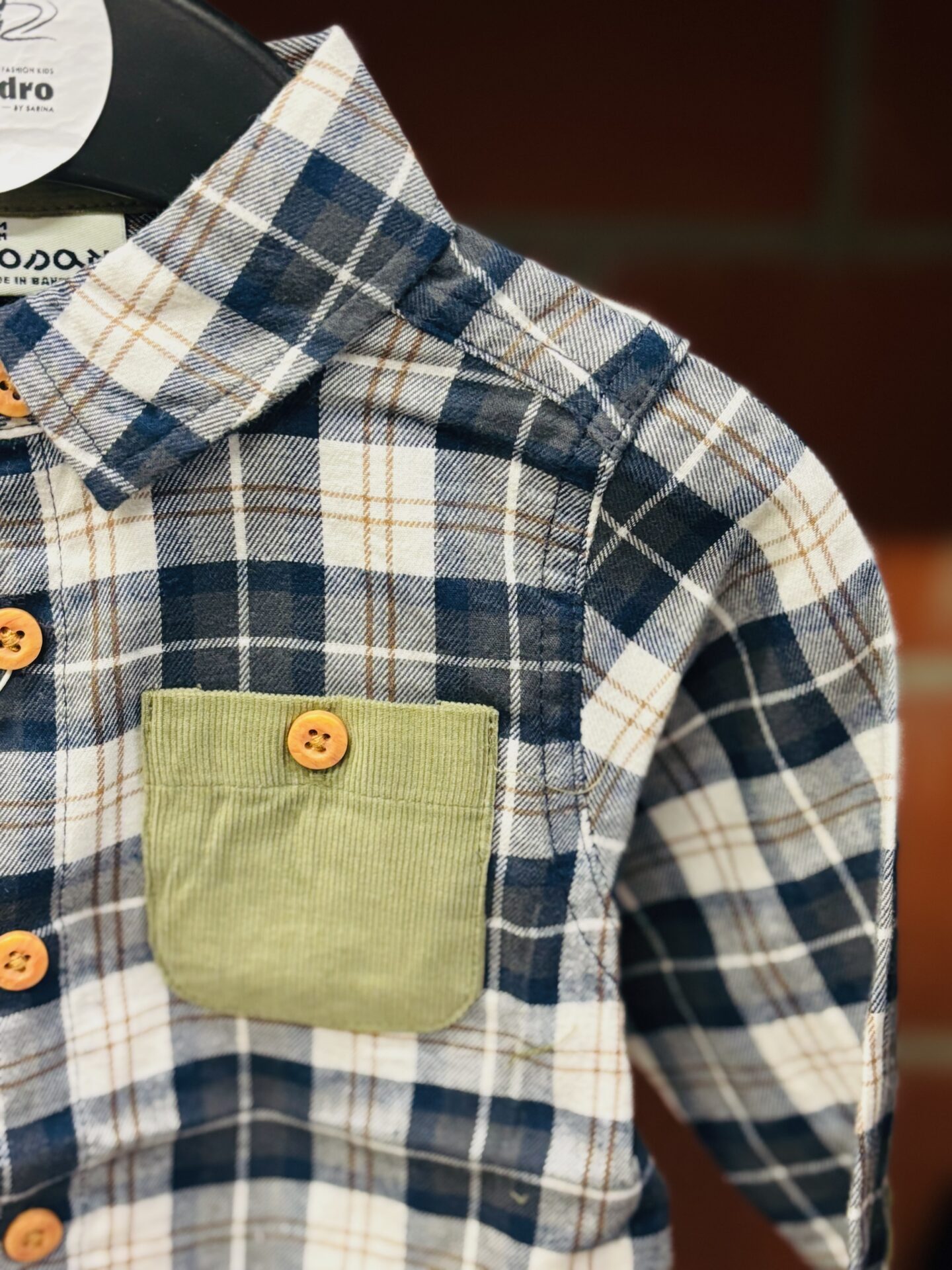 Chemise à carreaux bleu et beige.