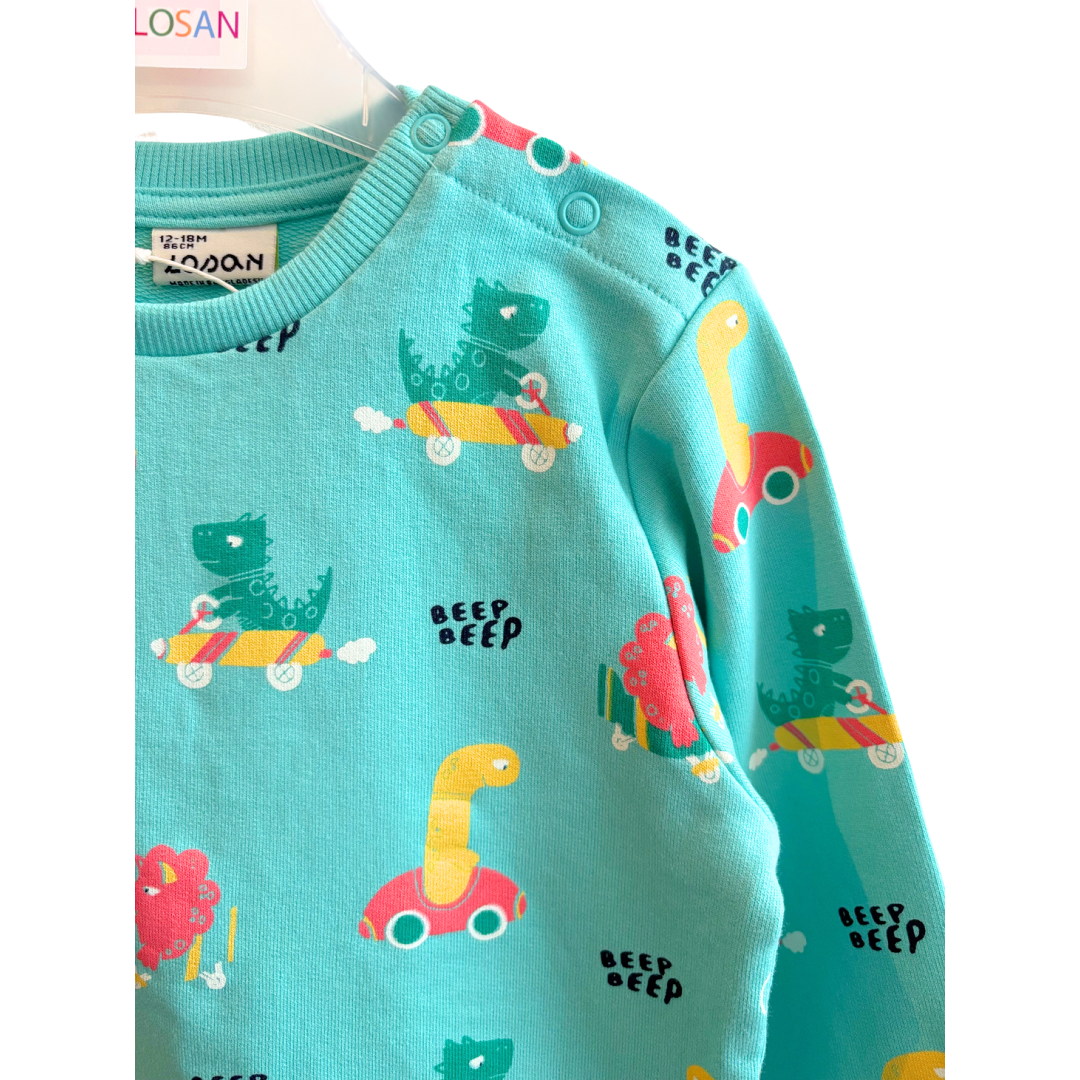 Sweat bleu avec dessin et bouton sur le coté du col.