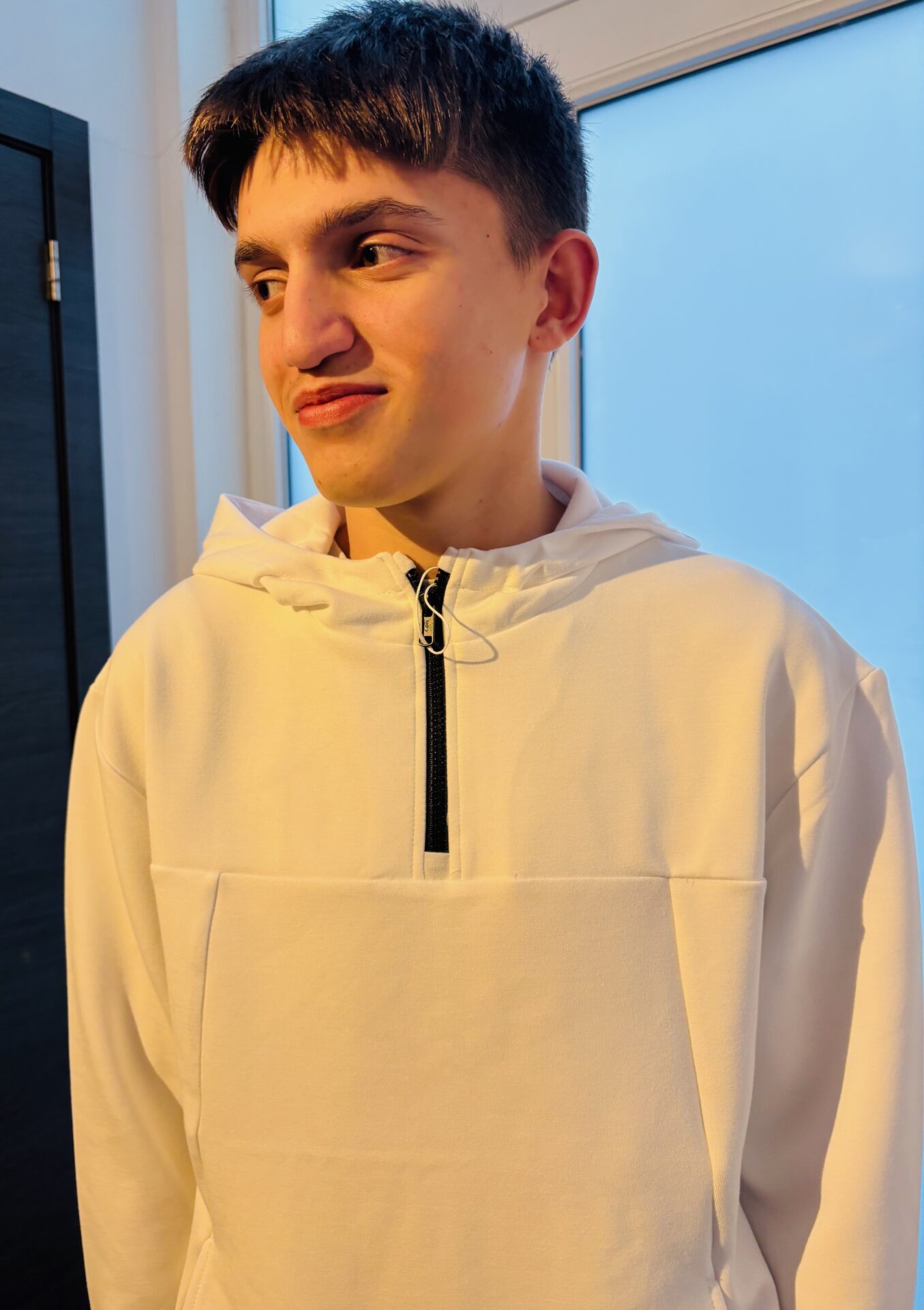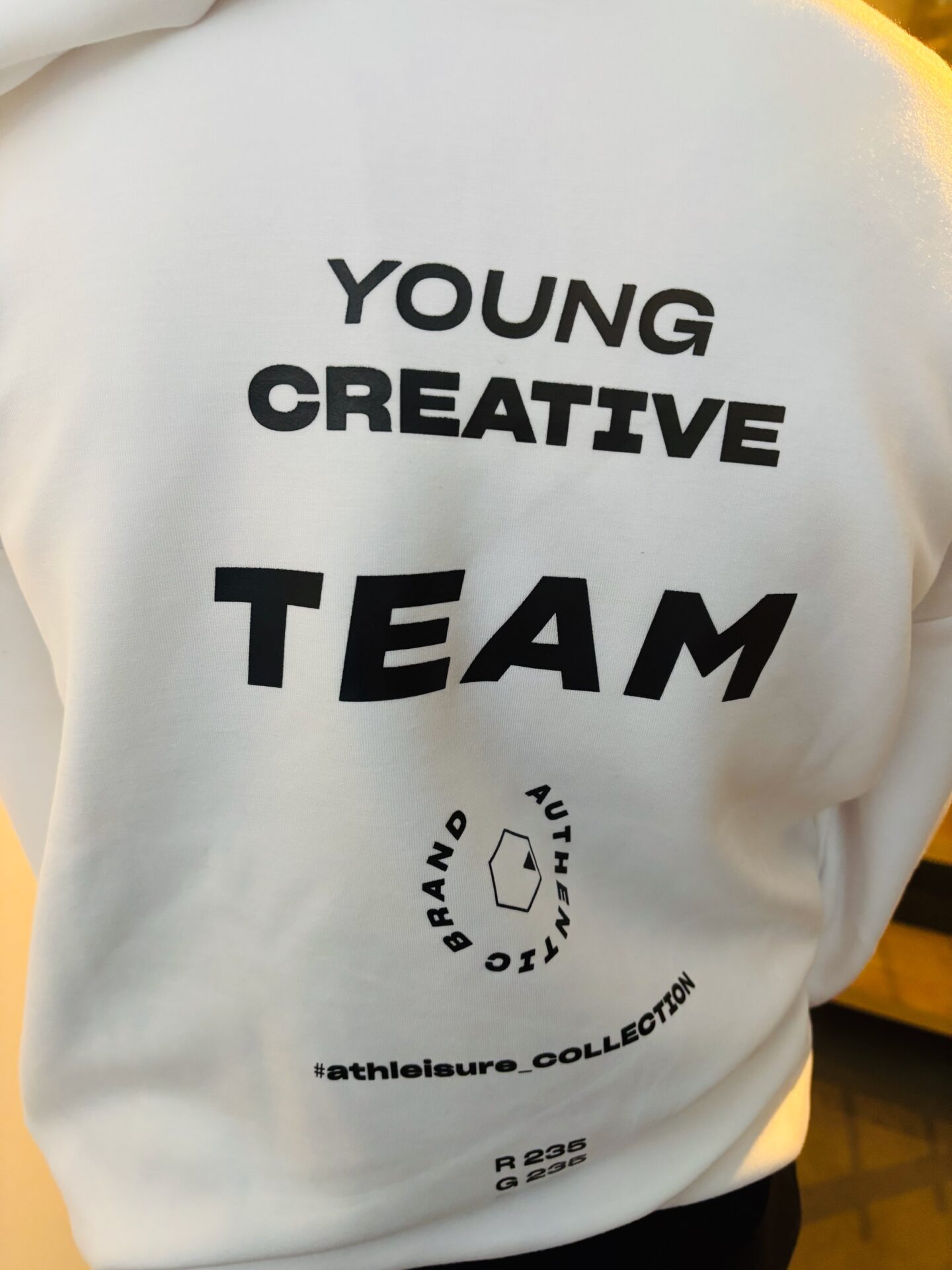 Sweat à capuche blanc avec écriture noir sur le derrière et tirette noir sur le devant.