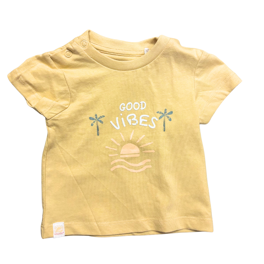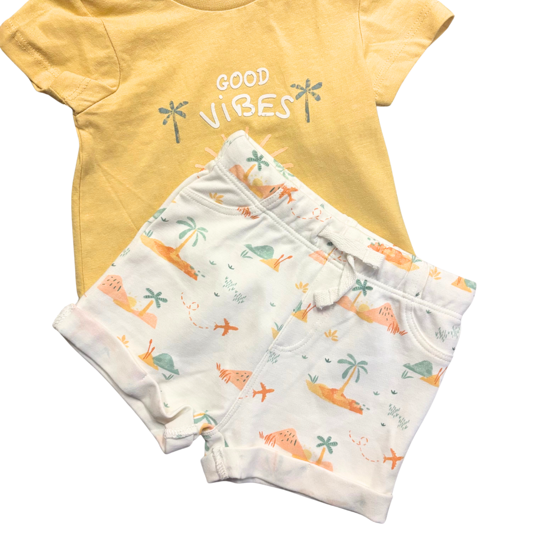 Ensemble t-shirt jaune et short beige à motif de vacance.