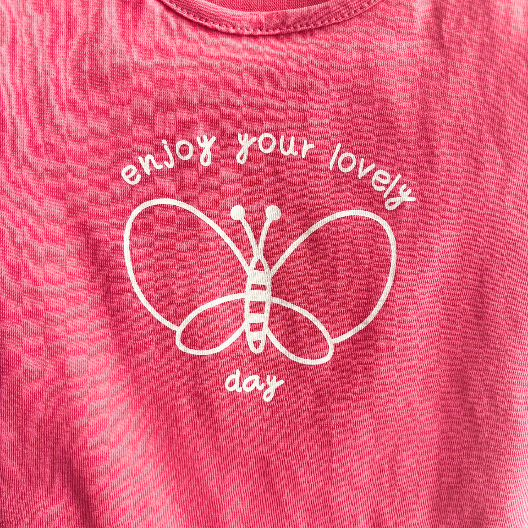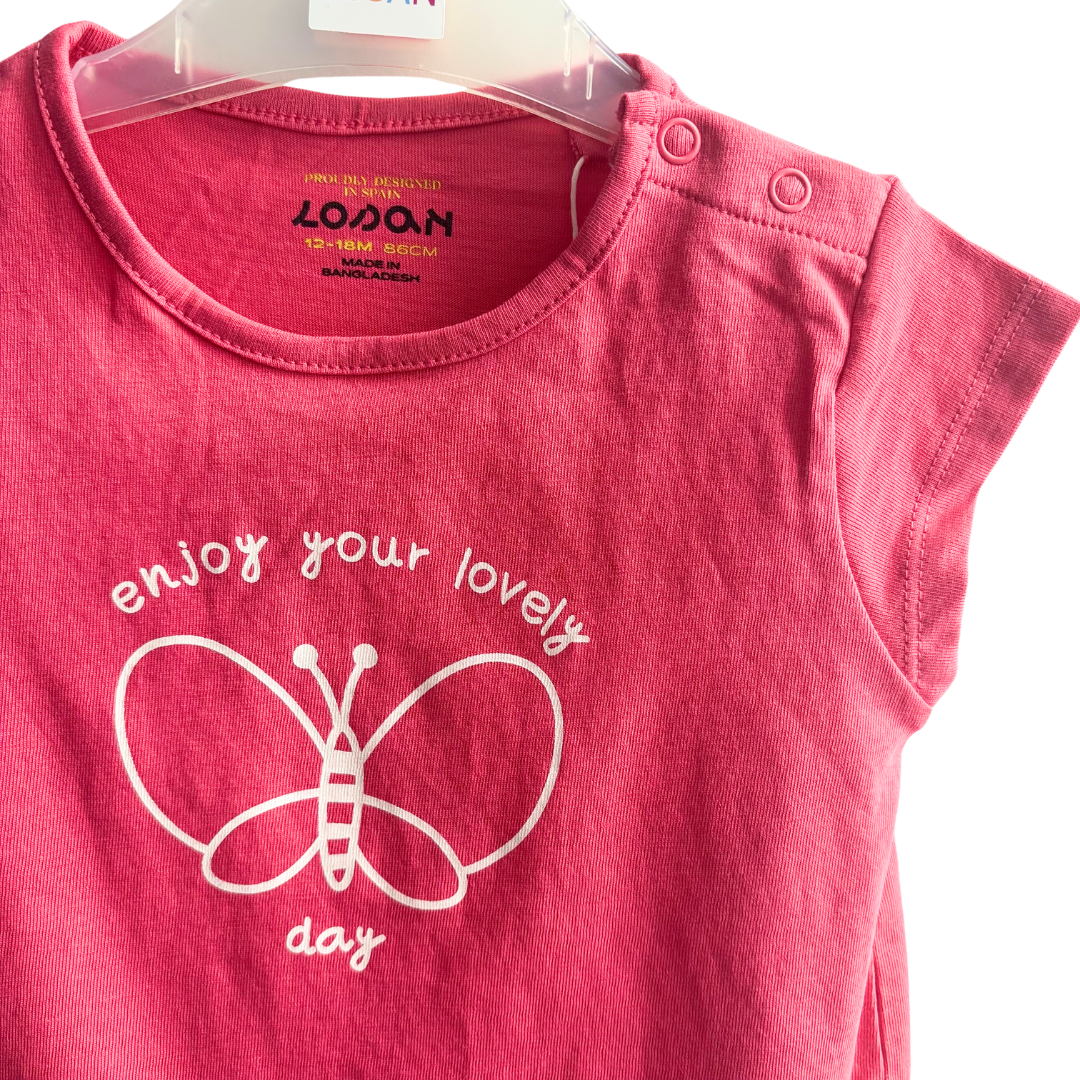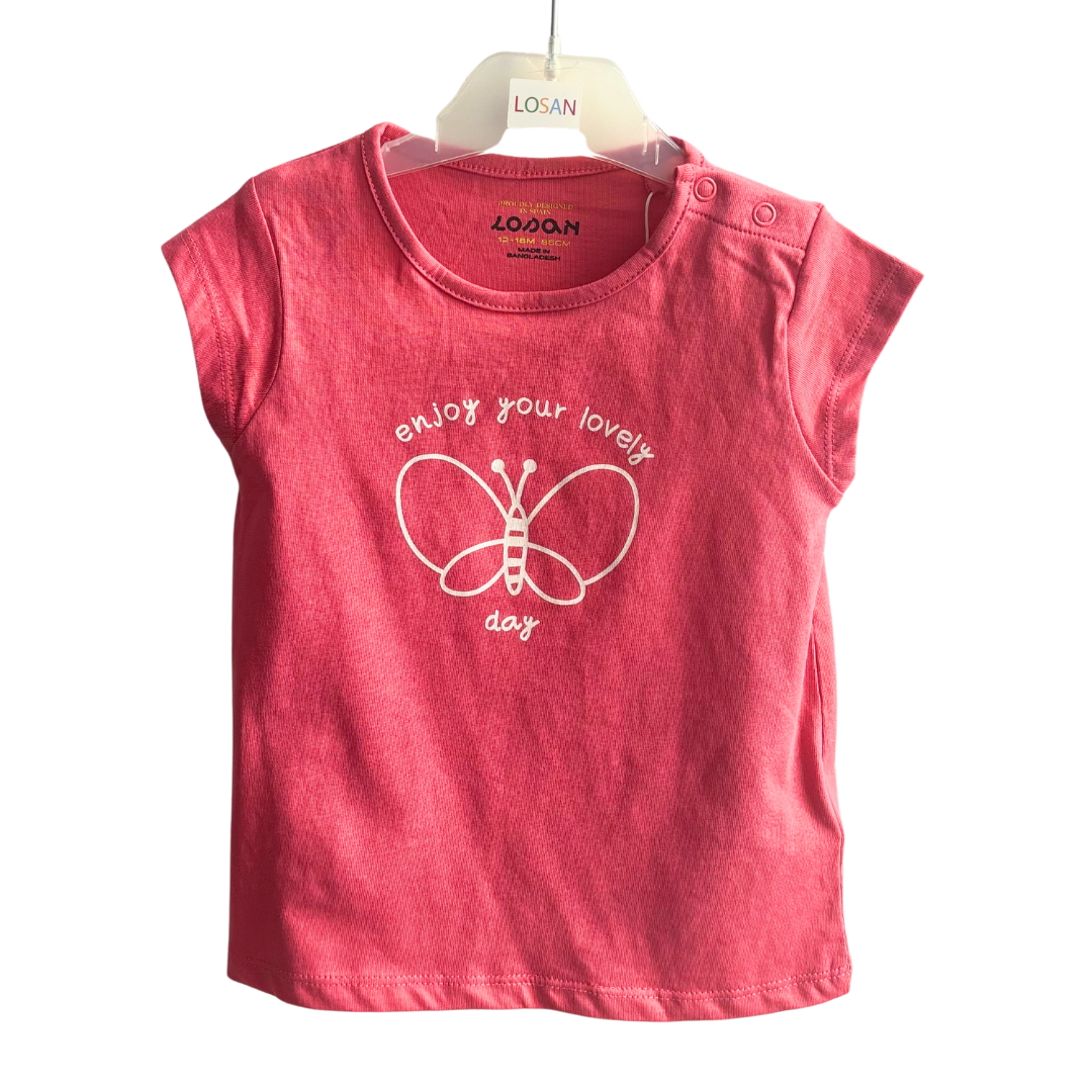 T shirt jersey fuchsia bébé fille avec papillon sur le devant.