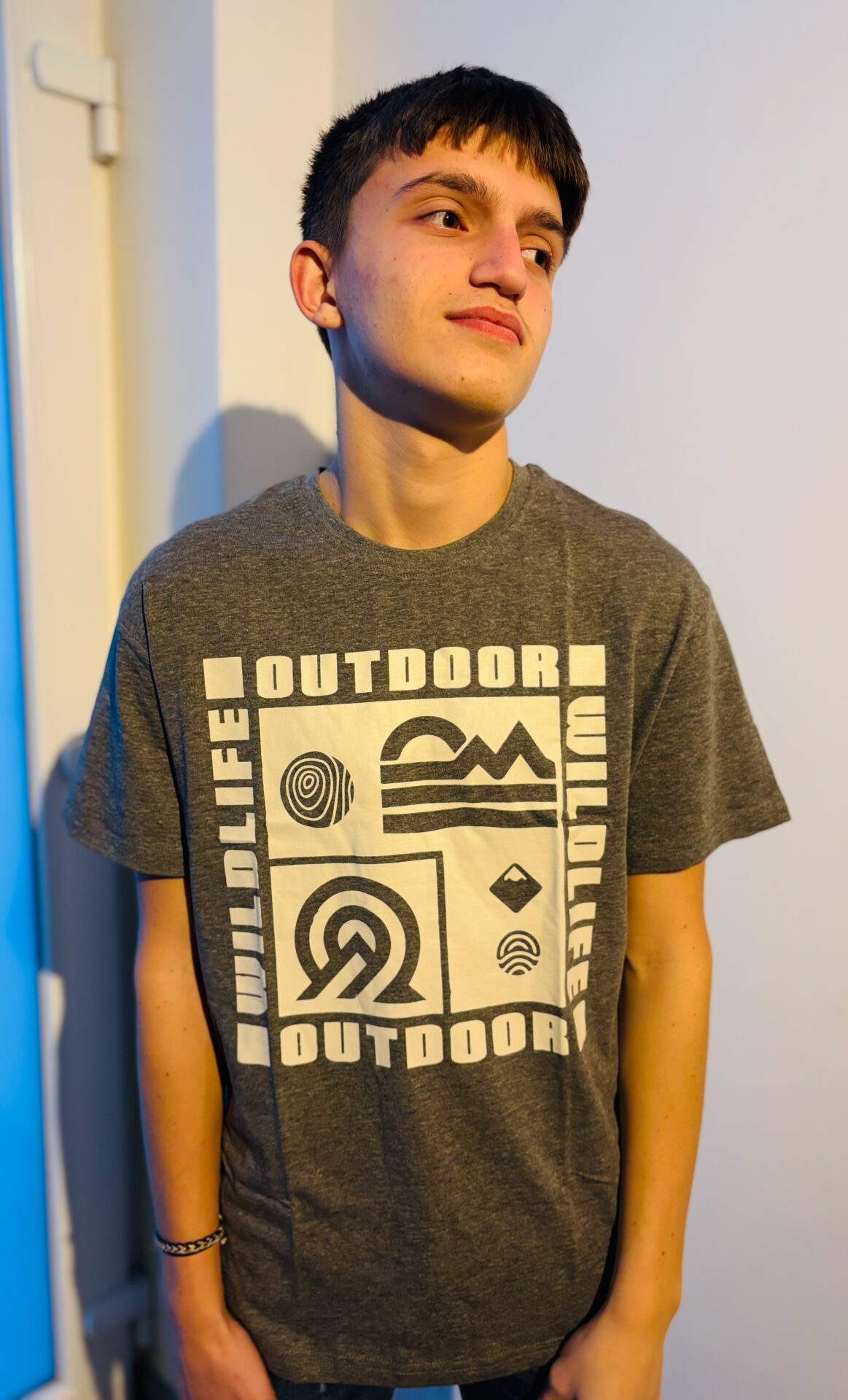 T-shirt gris avec écriture beige.